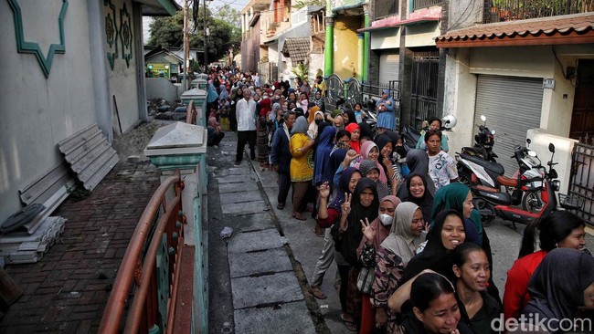 Jakarta - Ratusan warga antre paket sembako murah dalam program pangan bersubsidi di RPTRA Pesona Tipar, Semper Barat, Jakut, Kamis (14/8/2023). Ini penampakannya.