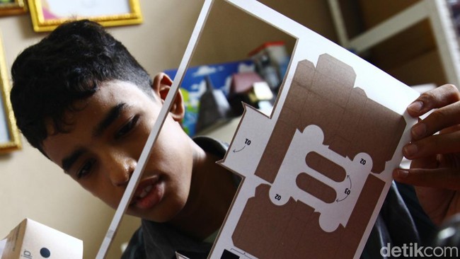 Rizky Ferriansyah membuat papercraft di studio rumahnya, di Jl Surilang, Jakarta Timur. Ia memulai hobi tersebut sesak 14 tahun lalu dan membangun komunitas papercraft ‘perikertas’ di platform media sosial.
