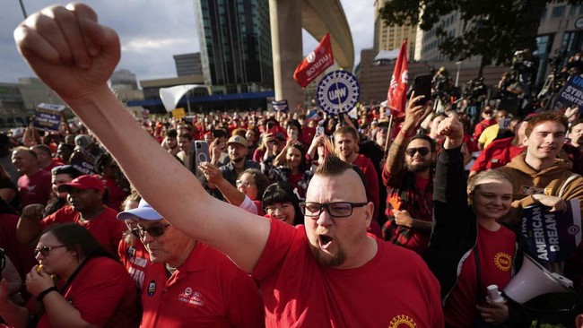 Amerika Serikat - Ribuan pekerja dari United Auto Workers (AUW) melakukan mogok kerja. General Motors (GM), Ford, dan Stellantis (induk Chrysler) pun kelimpungan.