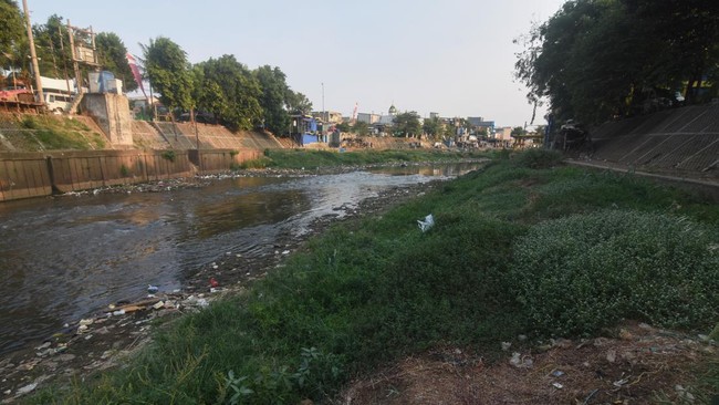 Jakarta - Kali Ciliwung mengalami pendangkalan akibat sedimentasi lumpur yang bercampur dengan sampah saat musim kemarau.