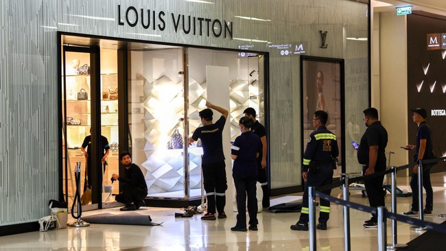 Pekerja memperbaiki pintu kaca sebuah toko mewah di dalam pusat perbelanjaan mewah Siam Paragon, Bangkok, Thailand, Rabu (4/10/2023).