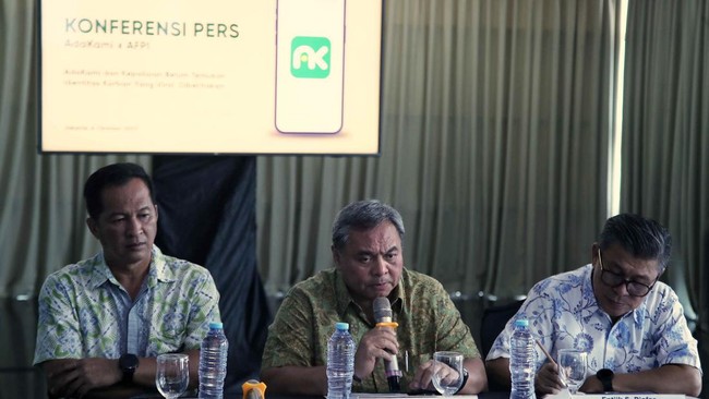 Ketua Umum Asosiasi Fintech Pendanaan Bersama Indonesia (AFPI) Terpilih Periode 2023-2026 Entjik S. Djafar (dari kanan) berbincang dengan Direktur Utama AdaKami Bernardino Moningka Vega Jr. dan Direktur Eksekutif Asosiasi Fintech Pendanaan Bersama Indonesia (AFPI) Kuseryansyah berbicara dalam konferensi pers di Jakarta, Jumat (6/10/2023).
