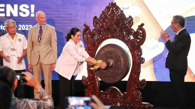 Ketua Umum DPP INSA (Indonesia National Shipowners Association) Carmelita Hartoto melakukan peresmian acara Indonesia Maritime Expo di Jiexpo Kemayoran, Jakarta, Selasa (17/10/2023). Indonesia Maritime Expo (IME) edisi ke-8 IME kembali hadir pada 17-19 Oktober 2023.