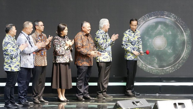 Presiden Jokowi didampingi Menkeu Sri Mulyani dan Gubernur BI Perry Warjiyo membuka acara BNI Investor Daily Summit 2023, di Hutan Kota by Plataran, Jakarta, Selasa (24/10/2023).
