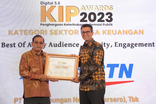 Ketua Komisi Informasi Pusat Donny Yoesgiantoro memberikan plakat kepada Corporate Secretary Bank BTN, Ramon Armando. Pengharagaan itu diterima Bank BTN berdasarkan pada tingkat keterbukaan informasi yang dilakukan korporasi diukur secara kuantitas dan kualitas dengan lebih menekankan keterlibatan atau kualitas komunikasi dengan publik melalui media sosial.