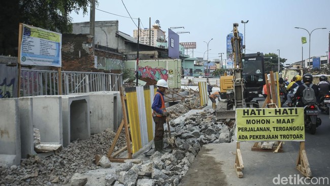Depok - Pemkot Depok kembali melanjutkan proyek trotoar Segmen I dan penataan trotoar Segmen II di Jalan Margonda. Begini progresnya.