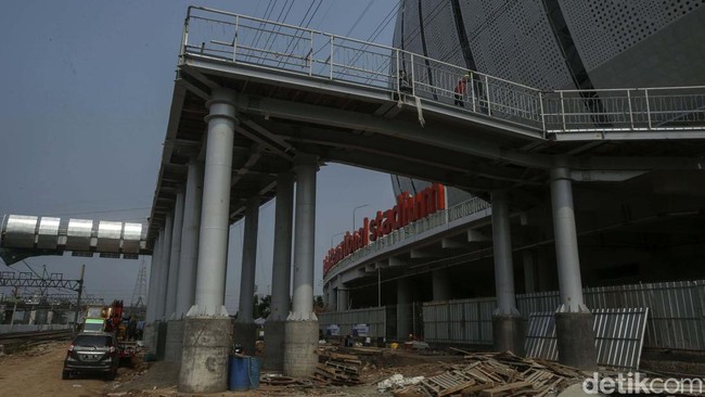 Jakarta - Jembatan Penyeberangan Orang (JPO) yang menghubungkan JIS ke kawasan Ancol, Jakarta, belum rampung dibangun. JPO ini untuk mendukung Piala Dunia U-17.