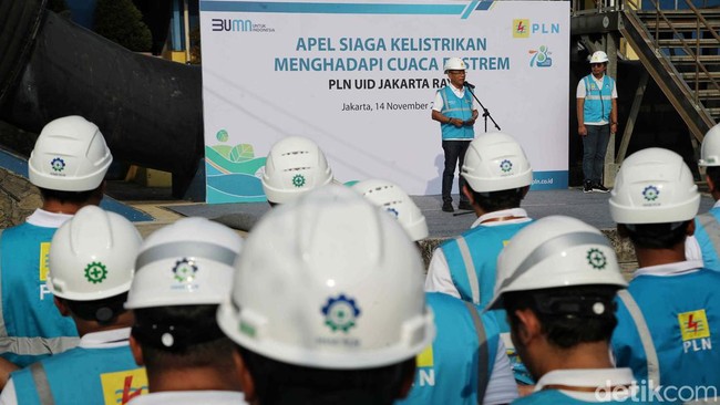 Jakarta - PLN gelar apel siaga kelistrikan di Waduk Pluit, Jakarta Utara, Selasa (14/11/2023). Apel dilakukan untuk kesiapan menyambut cuaca ekstrem.