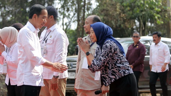 Presiden Joko Widodo meninjau pembangunan Miniatur Hutan Hujan Tropis Nusantara disambut oleh Vera Galuh Sugijanto, Direksi PT Tirta Investama dan Rudianto Amirta, Dekan Fakultas Kehutanan Universitas Mulawarman, IKN Nusantara, Rabu (20/12/2023). Dalam rangka mendukung strategi Otorita Ibu Kota Nusantara sebagai Net Zero City pada 2045, PT Tirta Investama mendukung reforestasi dengan pembangunan Miniatur Hutan Hujan Tropis bekerja sama dengan Universitas Mulawarman dengan dukungan dari Indo Tambang Raya Megah dan Multi Harapan Utama pada lahan seluas 96 ha serta pembangunan fasilitas pengelolaan sampah TPS3R Samtaku di IKN.