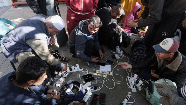 Gaza - Listrik menjadi barang berharga bagi warga Gaza, Palestina. Begini ramainya saat warga Gaza mendapatkan sumber listrik untuk mengisi daya HP mereka.