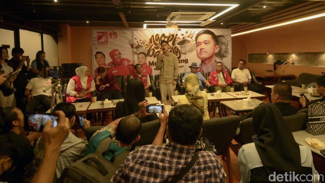 Ketua Umum Partai Solidaritas Indonesia (PSI) Kaesang Pangarep (tengah) berbincang dengan wartawan, warga dan para generasi muda di Bandar Lampung, Lampung, Jumat (19/1/2024).