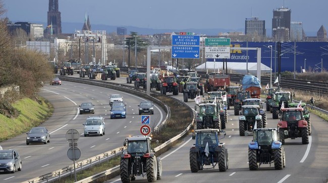 Para petani mengemudikan traktornya di jalan raya dekat Strasbourg; Perancis bagian timur, Rabu (24/1/2024). Para petani Perancis pada Rabu melakukan protes di seluruh negeri dan di Brussels menentang upah rendah dan peraturan yang berlebihan, kenaikan biaya dan masalah lainnya. AP/Jean-Francois Badias