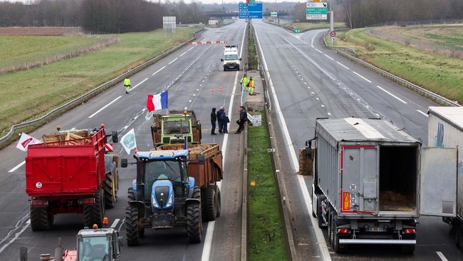 Paris - Para petani Prancis kembali memblokir jalan dengan traktor. Aksi ini dilakukan memprotes kenaikan harga dan pajak kepada petani.