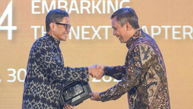Direktur Utama Bank BTN Nixon LP Napitupulu memberikan cinderamata kepada Wakil Menteri Luar Negeri Republik Indonesia Pahala Nugraha Mansury pada acara BTN Prioritas Economic Outlook 2024 di Surabaya.