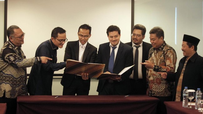 Kepala BP BPKH Fadlul Imansyah (kedua kiri), Anggota Bidang Investasi dan Kerjasama Luar Negeri M. Arief Mufraini (kiri), Pengurus BPKH Limited Sidiq Haryono (ketiga kiri), Ketua Dewan Pengawas Firmansyah N.Nazaroedin (kedua kanan) dan Anggota Dewas BPKH M Dawud Arif Khan (kanan) bersama mitra pada penandatanganan perjanjian kerja sama kemitraan di Jakarta, Kamis (15/4/2024).