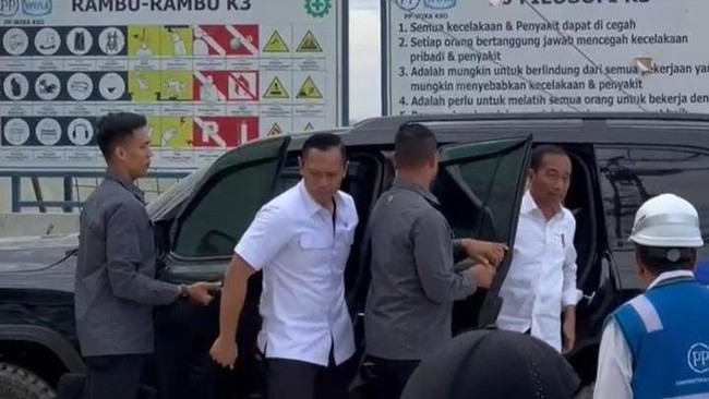 Kalimantan Timur - Menteri ATR/BPN Agus Harimurti Yudhoyono (AHY) mendampingi Presiden Jokowi mengecek pembangunan Ibu Kota Nusantara (IKN). AHY sempat semobil dengan Jokowi.
