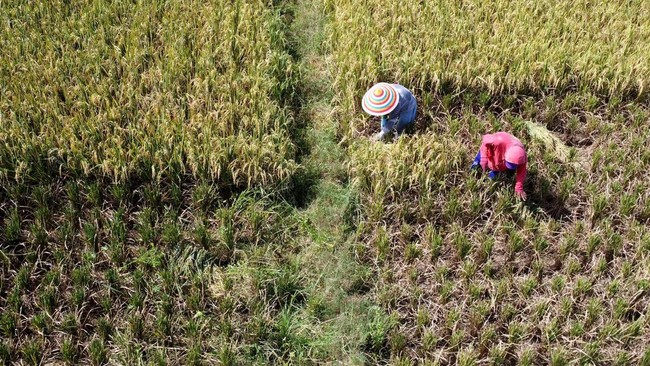 Gorontalo - Panen padi tengah terjadi di Kabupaten Bone Bolango, Gorontalo. Ini merupakan panen padi perdana untuk tahun 2024.