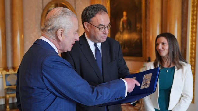London - Wajah Raja Charles III akan tampil di setiap lembaran uang kertas baru yang akan dicetak Inggris. Uang kertas baru ini rencananya mulai beredar Juni mendatang.