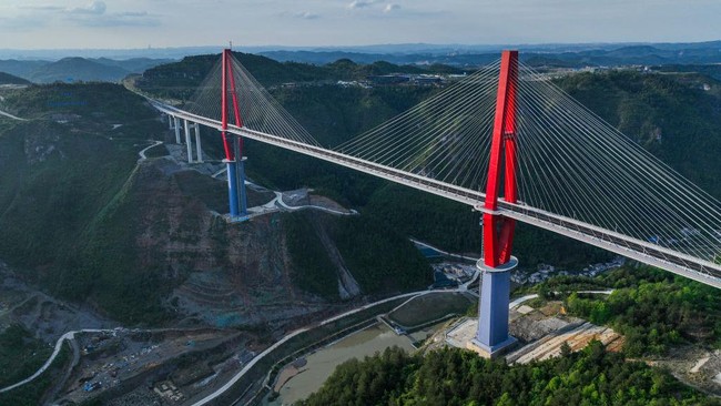 China - Jembatan sungai Longli di China sepanjang 1.260 meter ini diperkirakan akan dibuka awal bulan Mei. Begini penampakan jembatannya.