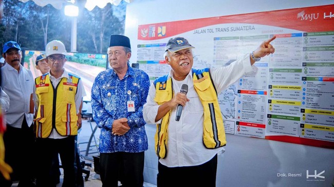 Sumatera Selatan - Menteri PUPR meninjau proyek Tol Trans Sumatera Bayung Lencir-Tempino Seksi 3 garapan Hutama Karya. Agenda ini sebagai rangkaian kunjungan kerja di Sumsel.