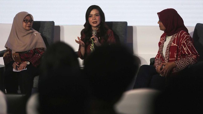 Deputi Direktur Pelaksanaan Edukasi Keuangan, Otoritas Jasa Keuangan (OJK) Halimatus Sadiyah, Head of Deposit and Wealth Management, UOB Indonesia Vera Margaret, dan Pendiri Sekolah Cikal Najelaa Shihab menjadi pembicara diskusi di Jakarta, Rabu (24/4/2024).