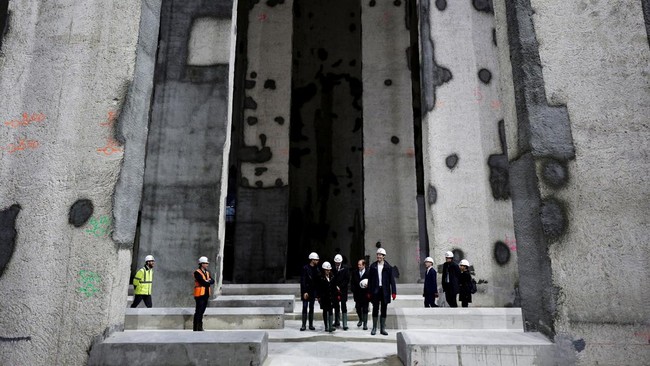Walikota Paris Anne Hidalgo dan pejabat lainnya menghadiri peresmian bak penyimpanan air limbah dan air hujan, Austerlitz, yang antara lain dimaksudkan untuk menjadikan Sungai Seine dapat digunakan selama Olimpiade Paris 2024, di Paris, Prancis, Kamis (2/5/2024). (Stephane De Sakutin/Pool via REUTERS)