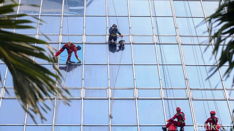 Sejumlah pekerja tengah melakukan pembersihan kaca pada salah satu gedung perkantoran di Jakarta, Jumat (3/5/2024).