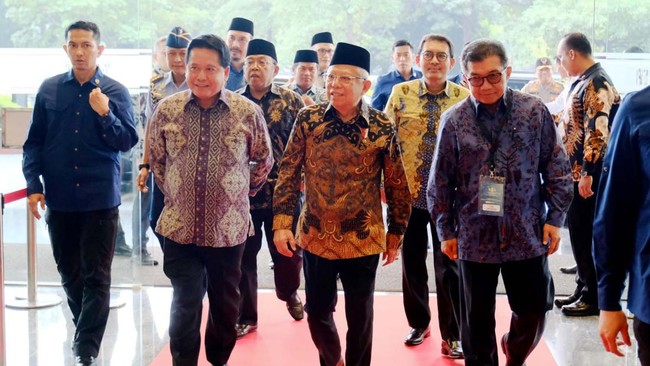 Jakarta - Wapres Ma'ruf Amin menghadiri silaturahmi Perkumpulan Bank Syariah Indonesia. Kedatangannya disambut Dirut BSI Hery Gunardi dan Komut BSI Muliaman D Hadad.