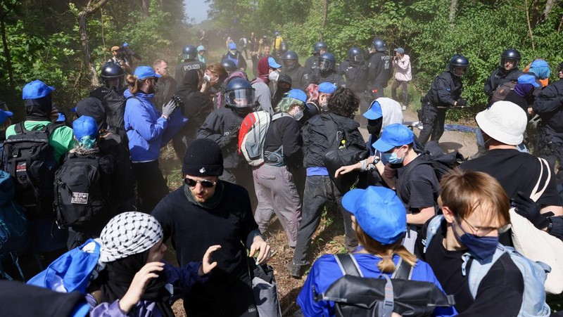 Polisi Brandenburg, yang dibantu oleh unit polisi negara bagian dari seluruh Jerman, mengatakan bahwa 1.500 petugas telah bersiaga sejak Sabtu (11/05) demi menangani lebih dari 1.000 pengunjuk rasa di luar kawasan pabrik.
