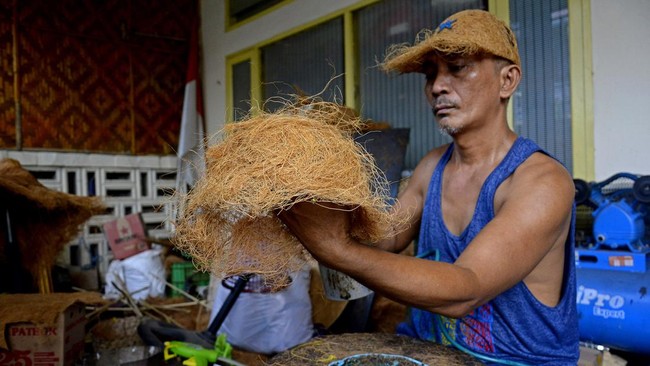 Sulawesi Selatan - Perajin asal Sulsel menjadikan sabut kelapa sebagai bahan baku kerajinan mulai dari tas hingga topi. Kerajinan itu dijual mulai Rp 15 ribu hingga Rp750 ribu.
