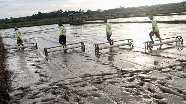 Sulawesi Tenggara - Petani melakukan penanaman padi dengan sistem tanam benih langsung (tabela) di Ranomeeto, Konawe Selatan, Sulawesi Tenggara. Begini proses penanamannya.