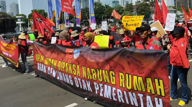 Jakarta - Gerakan Buruh bersama Rakyat (Gebrak) menggelar demo menolak Tabungan Perumahan Rakyat (Tapera). Aksi ini dilakukan di kawasan Patung Kuda, Jakarta Pusat.