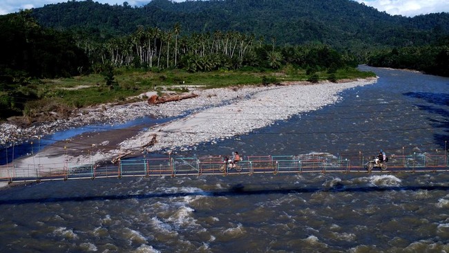 Warga melintasi jembatan gantung yang menjadi pintu masuk menuju tambang rakyat di Desa Tulabolo, Suwawa Timur, Kabupaten Bone Bolango, Gorontalo, Minggu (14/7/2024).