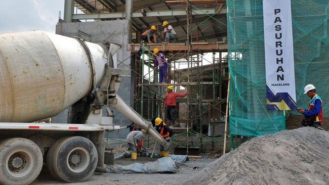 Sejumlah pekerja sedang membangun gedung hanggar pada proyek Tempat Pengolahan Sampah Terpadu (TPST) Pasuruhan, Mertoyudan, Magelang, Jawa Tengah, Rabu (17/7/2024).