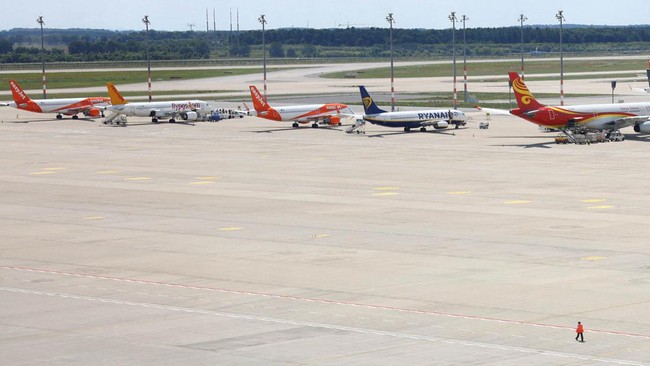 Berlin - Sejumlah pesawat parkir di Bandara Berlin, Jerman. Mereka terpaksa menganggur akibat terganggunya layanan penerbangan yang disebabkan Microsoft Windows tumbang.