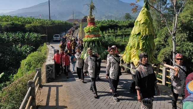 Temanggung - Sejumlah warga mengikuti kirab sambil mengusung gunungan saat tradisi Ruwat Rigen. Tradisi ini sebagai pertanda dimulainya musim panen tembakau di Temanggung.