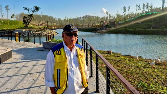 Menteri Pekerjaan Umum dan Perumahan Rakyat (PUPR) Basuki Hadimuljono dalam kunjungan kerjanya mendampingi Presiden Joko Widodo (Jokowi) di Ibu Kota Nusantara (IKN), berkesempatan meninjau sambil menikmati senja di Embung MBH Kawasan Inti Pusat Pemerintahan (KIPP) IKN, Senin (29/7/2024).