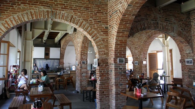 Wisatawan menikmati hidangan di kafe Benteng Van Den Bosch saat dibuka kembali pascarenovasi di Ngawi, Jawa Timur, Selasa (30/7/2024).