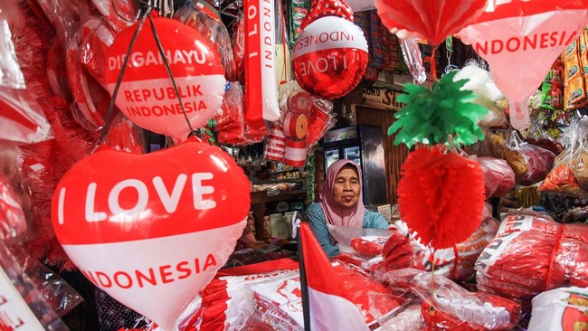 Jakarta - Tidak hanya bendera merah putih, beragam pernak-pernik juga marak dijual menjelang perayaan HUT ke-79 RI. Seperti terlihat di Pasar Kebayoran Lama, Jakarta.
