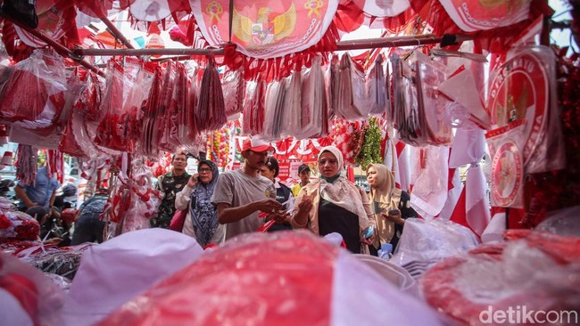 Jakarta - Jelang HUT RI, pernak-pernik hari kemerdekaan mulai diserbu warga. Seperti terlihat di Pasar Jatinegara, Jakarta, Rabu (7/8/2024).