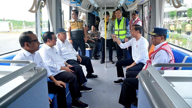 Kalimantan Timur - Presiden Joko Widodo menjajal Autonomous Rail Transit (ART), di IKN. Jokowi berharap angkutan massal berbasis listrik juga digunakan di kota-kota lain.
