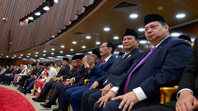 Presiden terpilih yang juga Menhan Prabowo Subianto duduk diapit Menko Perekonomian Airlangga Hartarto dan Menko Marves Luhut Binsar.