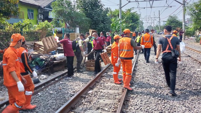 Jakarta - KAI Daop 1 Jakarta berkolaborasi dengan Team PPSU Pasar Senenen. Mereka membersihkan sampah di rel kereta.