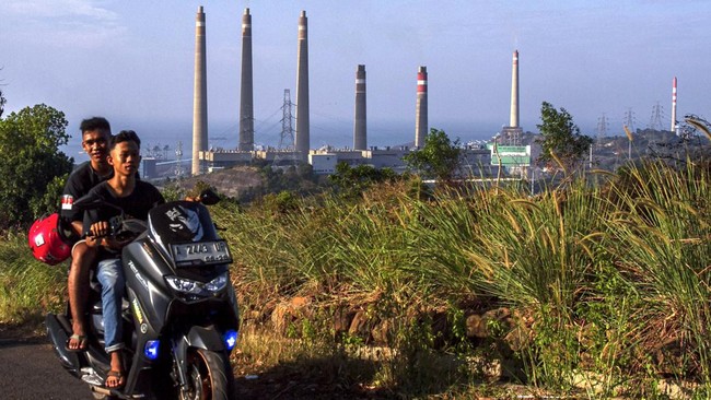Pengendara sepeda motor melintas di sekitar Pembangkit Listrik Tenaga Uap (PLTU) Suralaya, Cilegon, Banten, Minggu (8/9/2024).