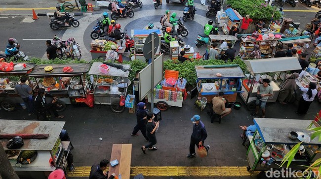 Jakarta - Sejumlah pedagang kaki lima (PKL) berjualan di jalur pejalan kaki di Jalan Blora, Jakarta Pusat. Jumlahnya yang tak sedikit, nyaris menutup akses pejalan kaki.