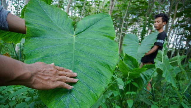 Pekerja memperlihatkan daun talas beneng hasil budidaya di Desa Karangrejo, Yosowilangun, Lumajang, Jawa Timur, Jumat (18/10/2024).