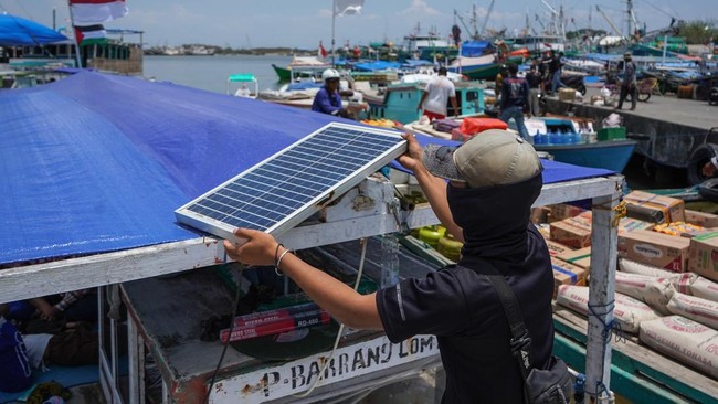 Makassar - Nelayan di Pelabuhan Paotere, Makassar, menggunakan panel surya sebagai sumber energi alternatif. Hal ini bisa menghemat biaya operasional saat melaut.