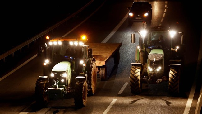 Petani Prancis melakukan aksi blokir jalan tol dengan traktor saat Presiden Prancis Emmanuel Macron sedang dalam kunjungan kenegaraan ke Argentina.