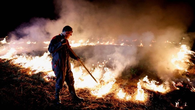Seorang petani Prancis membakar jerami di ladang untuk memprotes perjanjian perdagangan antara Uni Eropa (UE) dan negara-negara Amerika Latin yang tergabung dalam Mercosur, di Puyreaux, Prancis, Senin (18/11/2024).