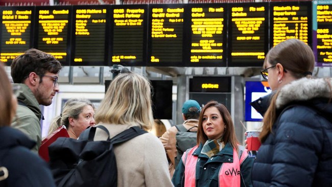 Seorang karyawan Great Western Railway berbicara kepada penumpang kereta api setelah pembatalan kereta yang disebabkan oleh Badai Bert di Stasiun Paddington di London, Inggris, Senin (25/11/2024).